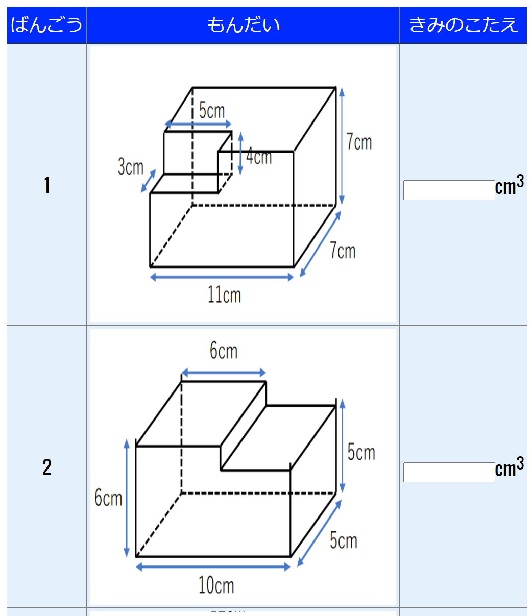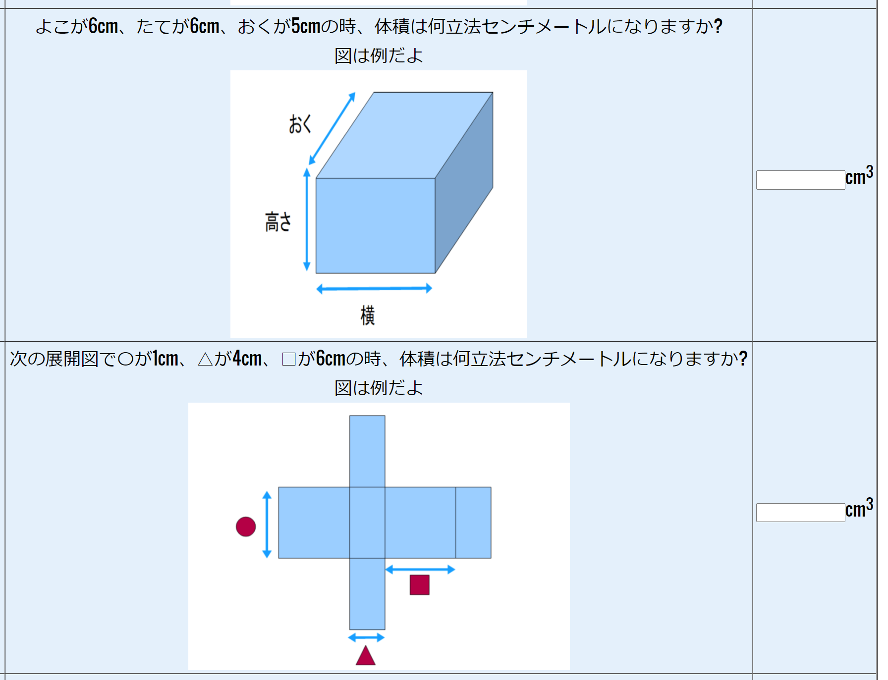 今回は箱の体積と展開図から体積を求める2つを用意しています。