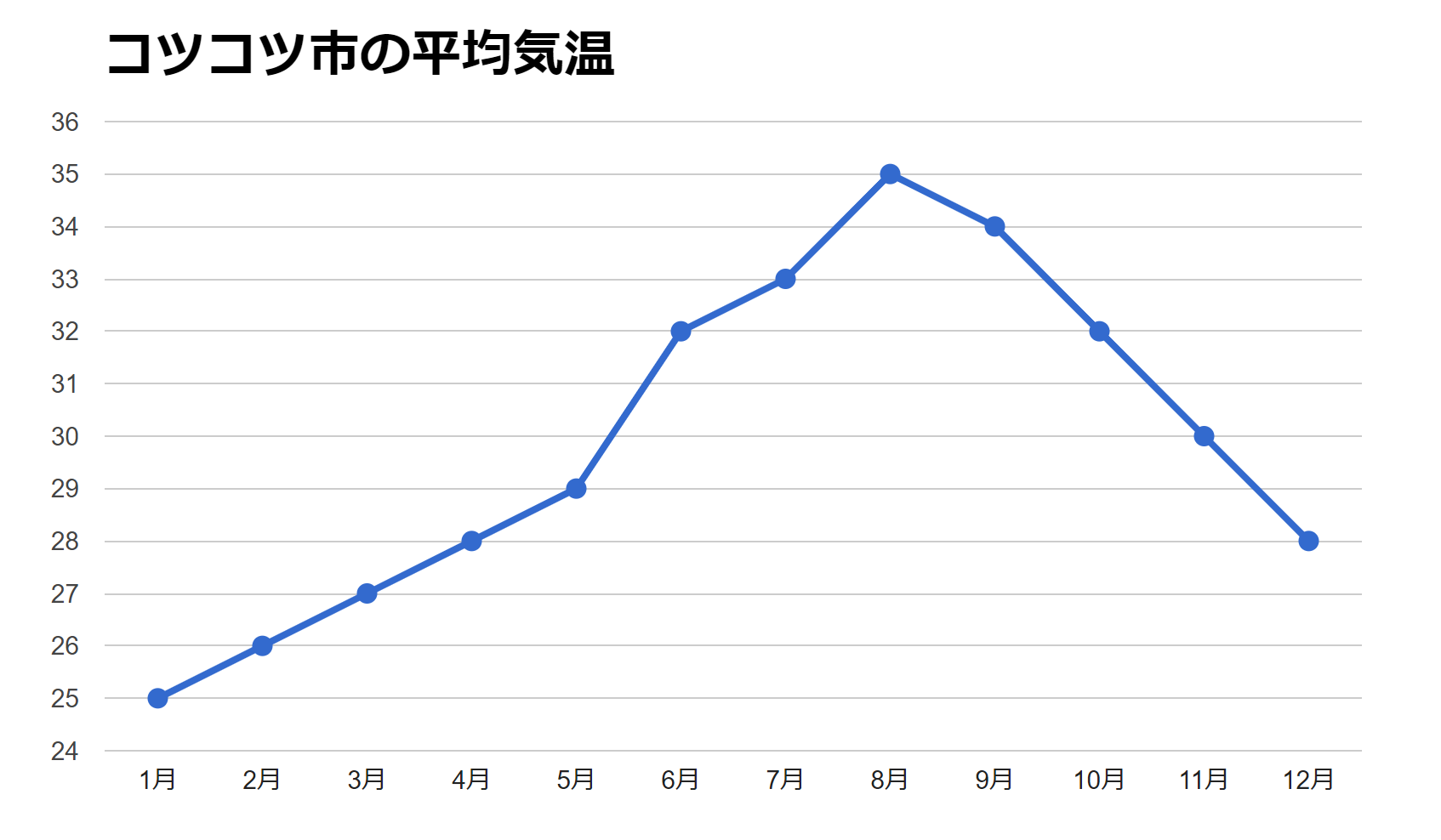 こつこつ市の年間の気温がランダムで変わり、折れ線グラフで